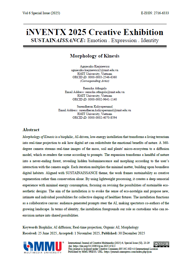 Morphology of Kinesis is a biophilic, AI-driven, low-energy installation that transforms a living terrarium into real-time projection to ask how digital art can redistribute the emotional benefits of nature. A 360-degree camera streams real-time images of the moss, soil and plants' micro-ecosystem to a diffusion model, which re-renders the scene according to prompts. The expansion transforms a handful of nature into a never-ending forest, revealing hidden bioluminescence and morphing according to the user’s interaction with the camera angle. Each iteration multiplies the minimal matter, building upon boundless digital habitats. Aligned with SUSTAINAISSANCE theme, the work frames sustainability as creative regeneration rather than conservation alone. By using lightweight processing, it creates a deep sensorial experience with minimal energy consumption, focusing on revising the possibilities of sustainable eco-aesthetic designs. The aim of the installation is to evoke the sense of eco-nostalgia and propose new, intimate and individual possibilities for collective shaping of healthier futures. The installation functions as a collaborative canvas: audience-generated prompts steer the AI, making spectators co-authors of the growing landscape. In terms of identity, the installation foregrounds our role as custodians who can re-envision nature into shared possibilities.