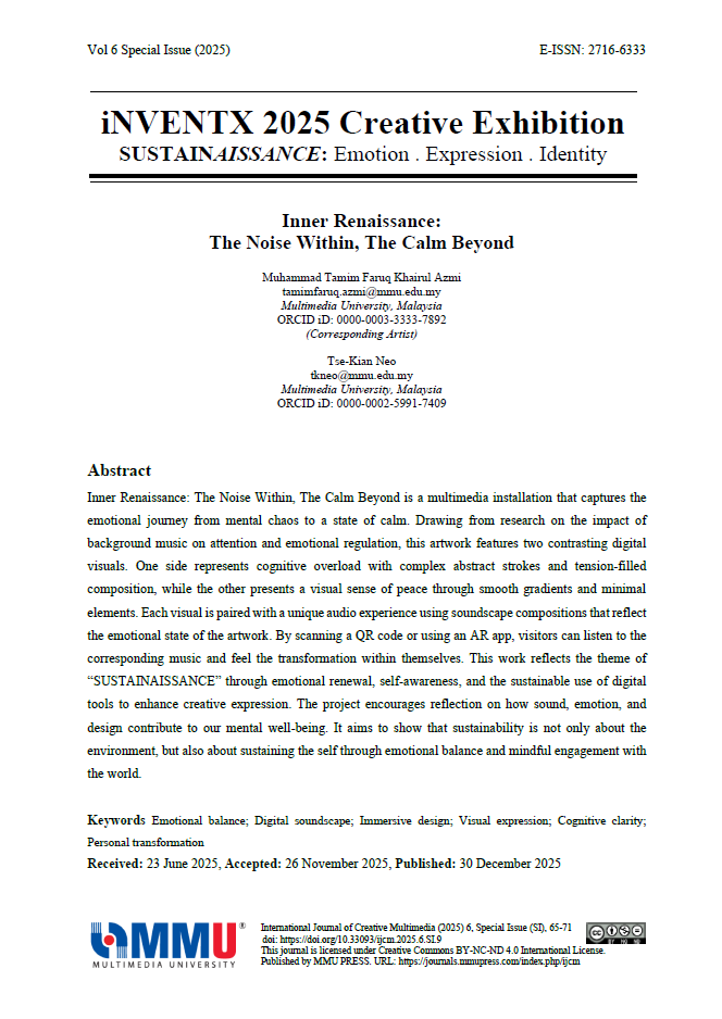 Inner Renaissance: The Noise Within, The Calm Beyond is a multimedia installation that captures the emotional journey from mental chaos to a state of calm. Drawing from research on the impact of background music on attention and emotional regulation, this artwork features two contrasting digital visuals. One side represents cognitive overload with complex abstract strokes and tension-filled composition, while the other presents a visual sense of peace through smooth gradients and minimal elements. Each visual is paired with a unique audio experience using soundscape compositions that reflect the emotional state of the artwork. By scanning a QR code or using an AR app, visitors can listen to the corresponding music and feel the transformation within themselves. This work reflects the theme of “SUSTAINAISSANCE” through emotional renewal, self-awareness, and the sustainable use of digital tools to enhance creative expression. The project encourages reflection on how sound, emotion, and design contribute to our mental well-being. It aims to show that sustainability is not only about the environment, but also about sustaining the self through emotional balance and mindful engagement with the world.